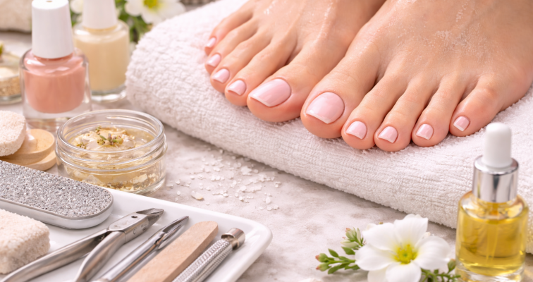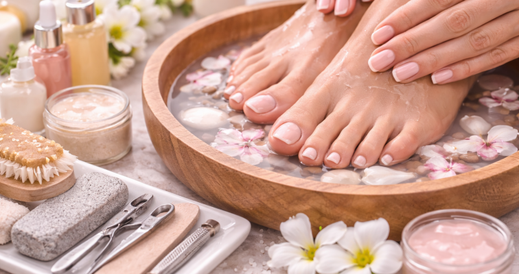 This treatment begins with a warm, soothing foot soak to soften the skin and prepare the feet for exfoliation. Dead skin is gently buffed away to reveal smoother, softer heels and soles. Cuticles are carefully tidied and nails shaped to create a clean, polished finish.