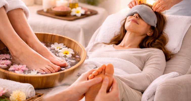 Your session then flows into reflexology, where precise pressure is applied to specific points on the feet that correspond to the whole body. This supports natural balance, promotes deep relaxation, and encourages overall renewal.